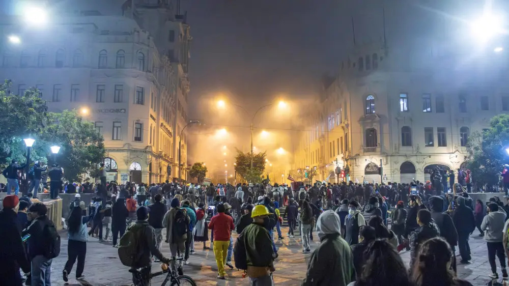 Los manifestantes protestan contra José Jeri (presidente acusado de violación y que dejó de seguir cientas de cuentas porno en sus redes tras asumir hace cinco días).