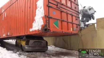 An unusual accident involving very bad math and very lucky people has happened in Almaty. A crane mounted on a truck was moving a heavy 40-ton container, but the crane-man failed to calculate the permissible weight correctly and the crane toppled over dropping the container precisely on the top of a taxi that pulled over in a nearby alley minutes before. By a sheer luck the taxi was empty when this happened. Both the driver and the passenger stepped out of the car moments before the crash. The incident was settled peacefully. The weighty container we removed from the roof of the car and the owner of the crane fully compensated the damages to the taxi company. By Tatyana Kuzmina