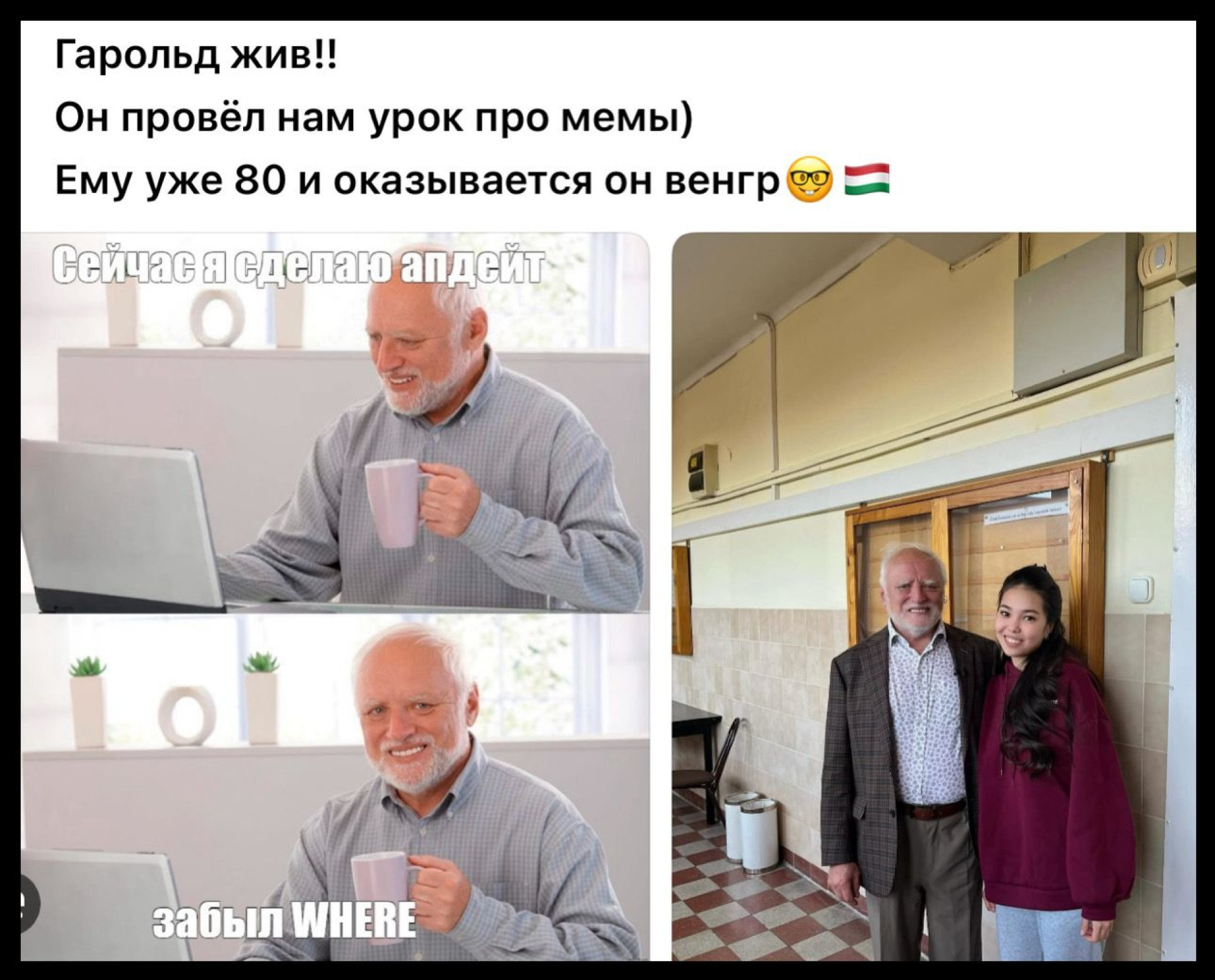 Tengrinews.kz – A Kazakhstani student unexpectedly found herself attending a lecture by one of the most recognizable meme characters in the world — Hide the Pain Harold. A video of the lecture at a Hungarian university quickly went viral on social media, evoking a wave of emotions and nostalgia among users.