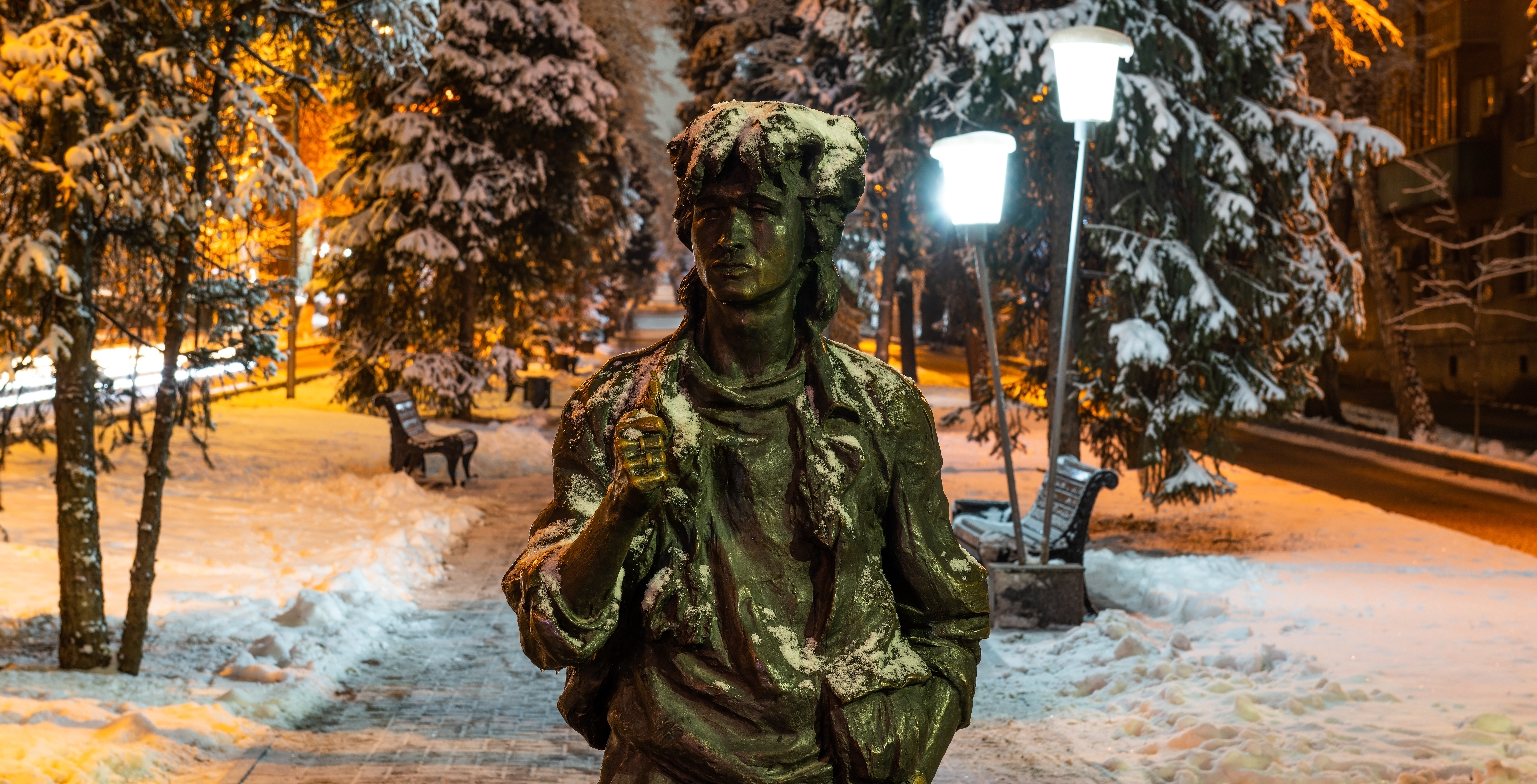 The sculpture is located on Tulebaev Street, named in honor of the great Kazakh composer Mukan Tulebaev. It is an ideal place for walking. In the upper part of the street, there is a fountain with a monument to the composer; if you move towards the lower part, you can visit the Dinmukhamed Kunaev Museum, the Kazakh National Opera and Ballet Theater named after Abai, and the “Arasan” Bathhouse complex. Viktor Tsoi’s monument is a popular photo shoot location during the day. You can also take good photos at night since it’s illuminated by floodlights.