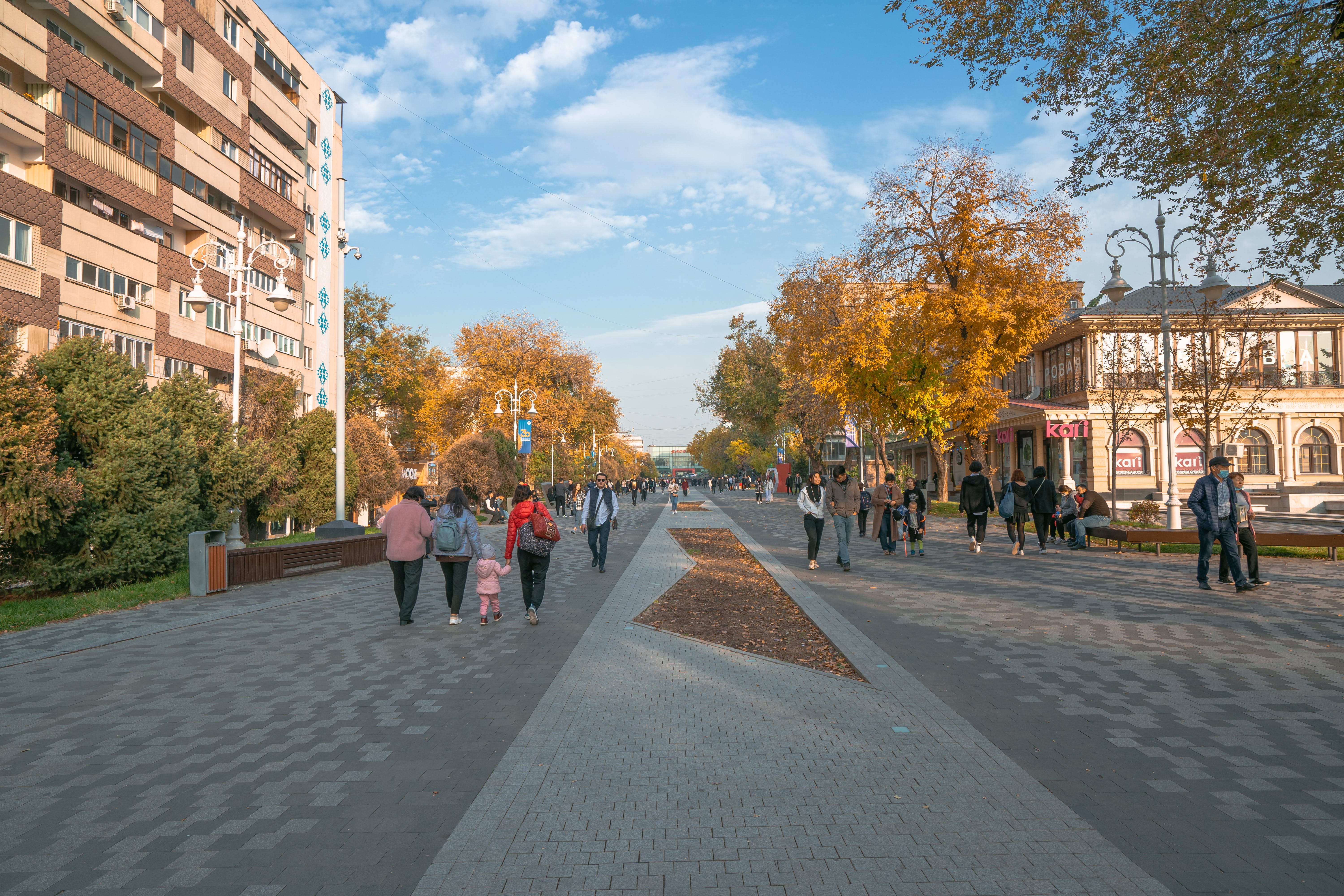 The pedestrian zone Zhibek Zholy (translated from Kazakh as “Silk Road”) stretches from Abylai Khan Street to Kunaev Street. This street has historical, cultural, and commercial significance. Since Soviet times, Zhibek Zholy has been a point of attraction for young people. Here, you can find high-fashion boutiques, art galleries, cozy cafes, restaurants, and a wall by the legendary rock musician Viktor Tsoi.