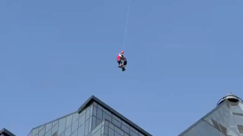 In another video, a cable can be seen being lowered from the helicopter to lift two people off the roof of a building.