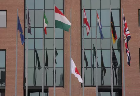 The Japanese flag flies at half-staff at the Japanese Embassy in Astana.
