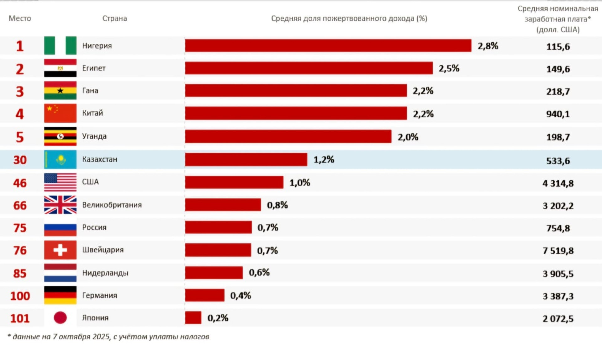 The ranking shows that Kazakh citizens donate an average of 1.2% of their income to charity, a level higher than in several developed countries including the U.S., the U.K., Germany, and the Netherlands.