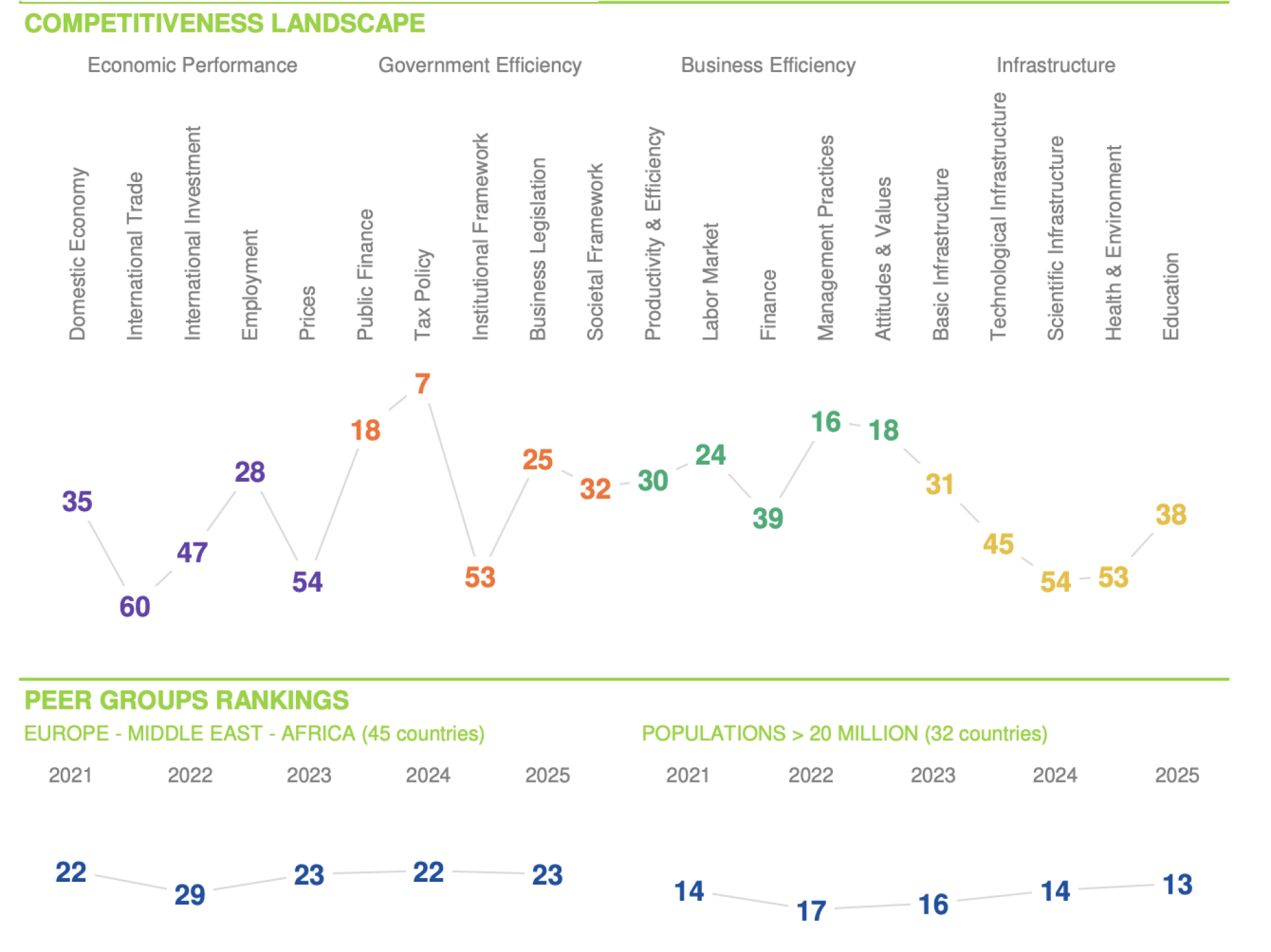 - Government efficiency: 22nd place (score 63.2). This indicator remains stable.