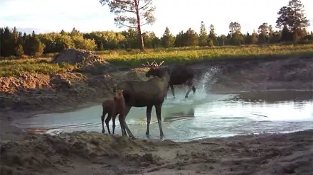 “The camera recorded an amazing moment: a mother moose with her calves peacefully drinking from a pond, when a large bull moose with impressive antlers slowly approached them,” the reserve staff said.