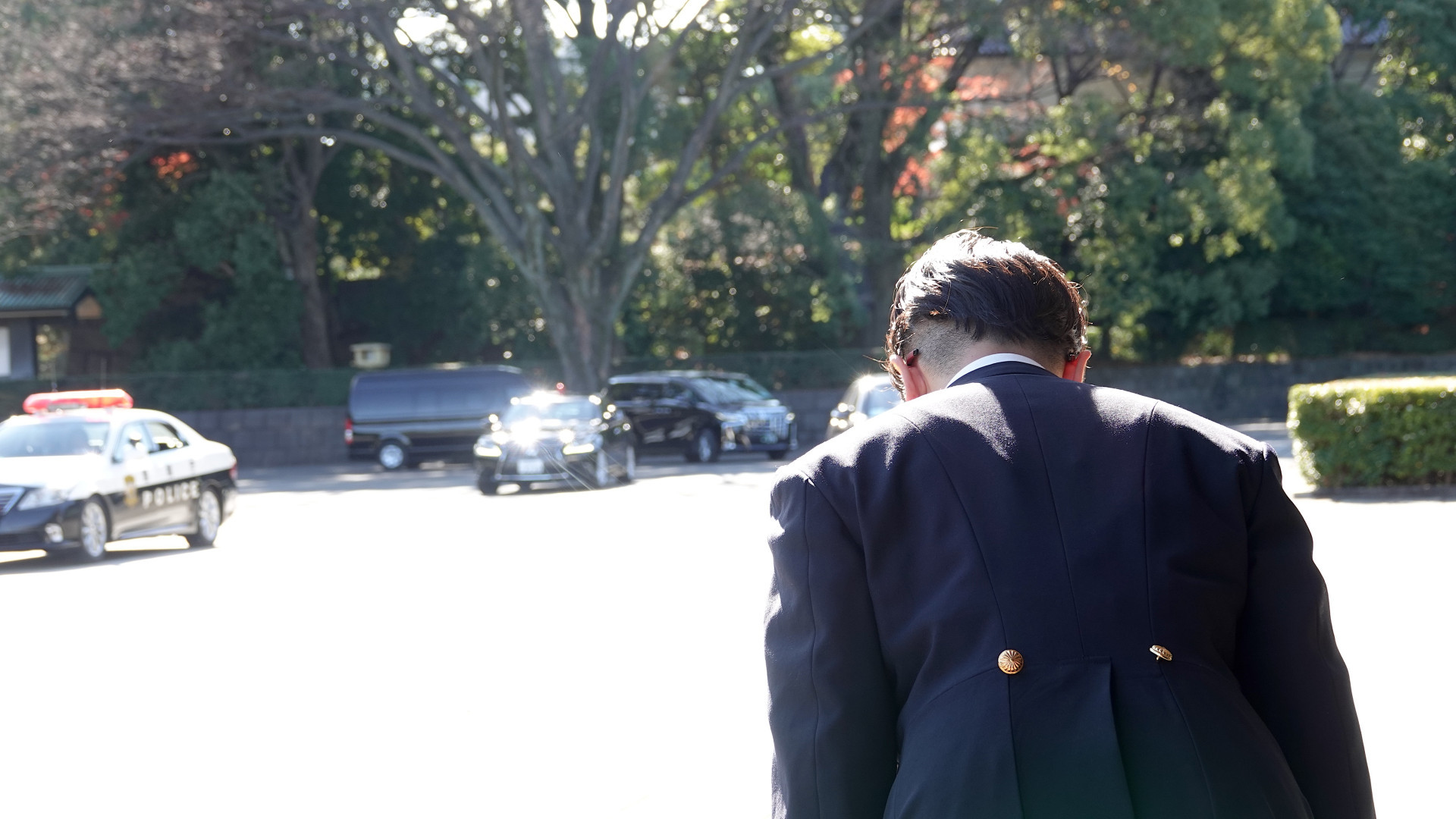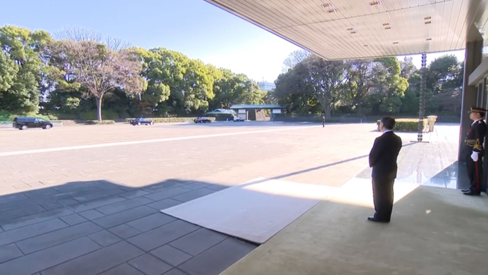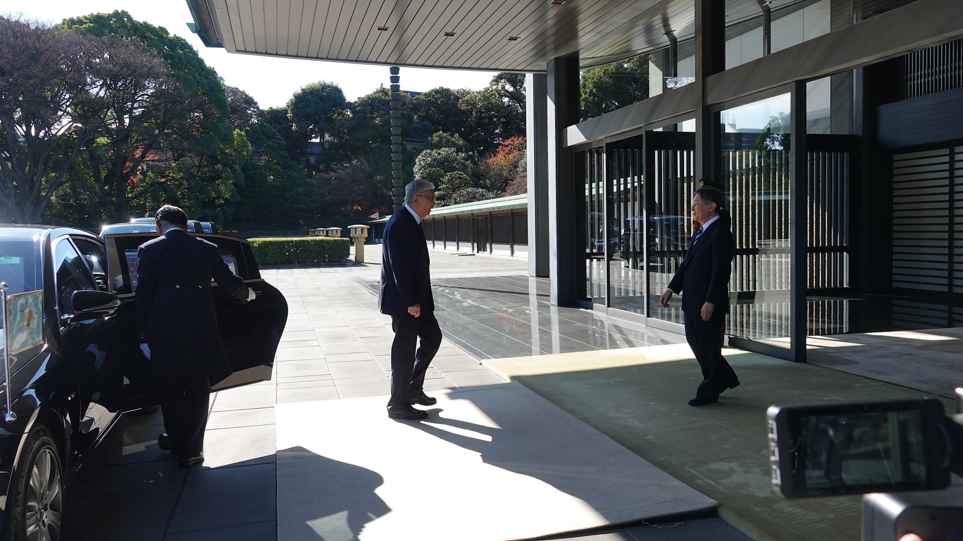 Tokayev bids farewell to Naruhito. The Emperor watches the motorcade until it reaches the gates. Officers at the palace remain motionless.
