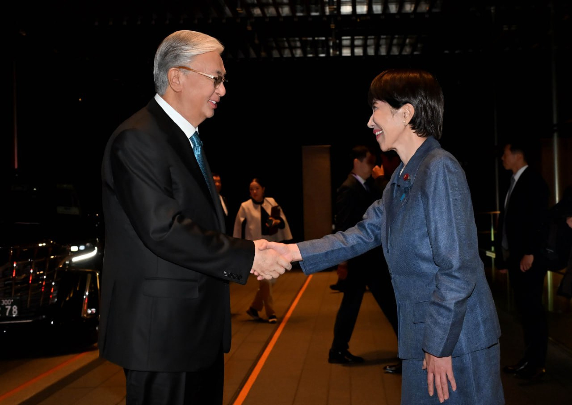 Japan’s Prime Minister Sanae Takaichi meets the President of Kazakhstan at the entrance, not retreating indoors despite the evening chill. A smile is the main sign of greeting.