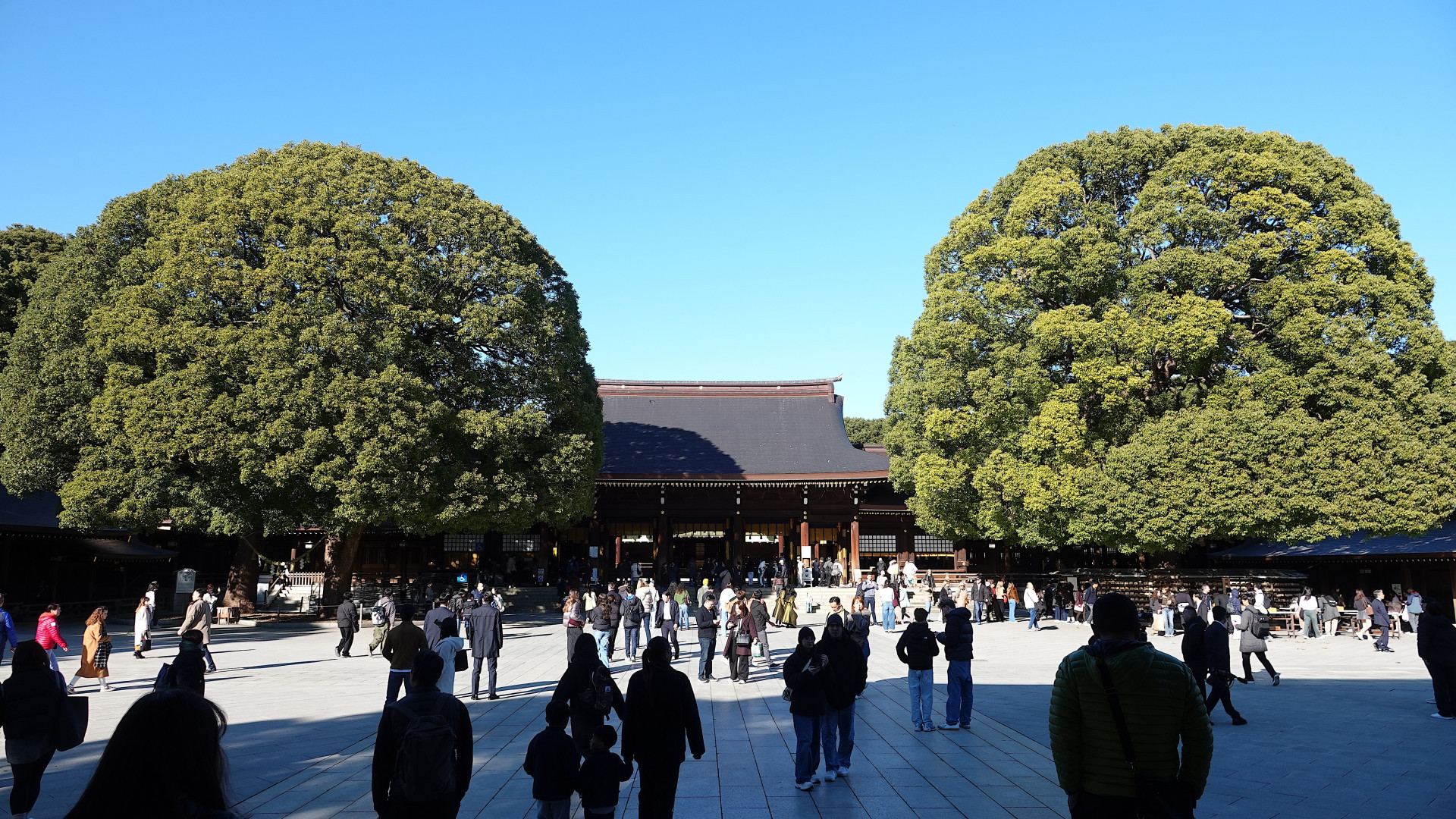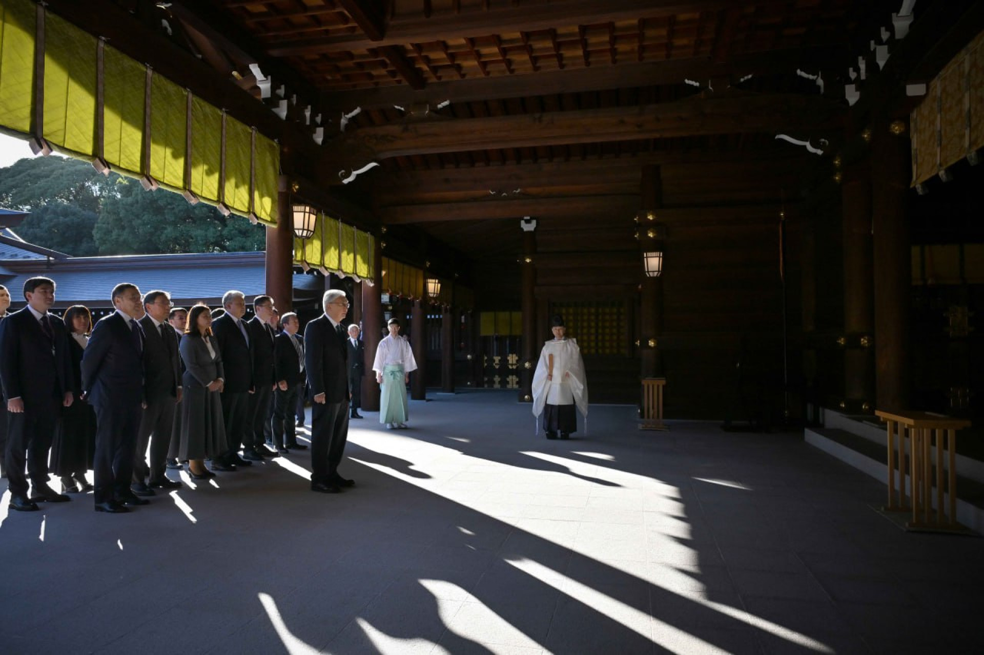 The rhythm of the visit changes — no palace halls or protocol pauses. The President heads to Meiji Jingu, a Shinto shrine in the very center of Tokyo.