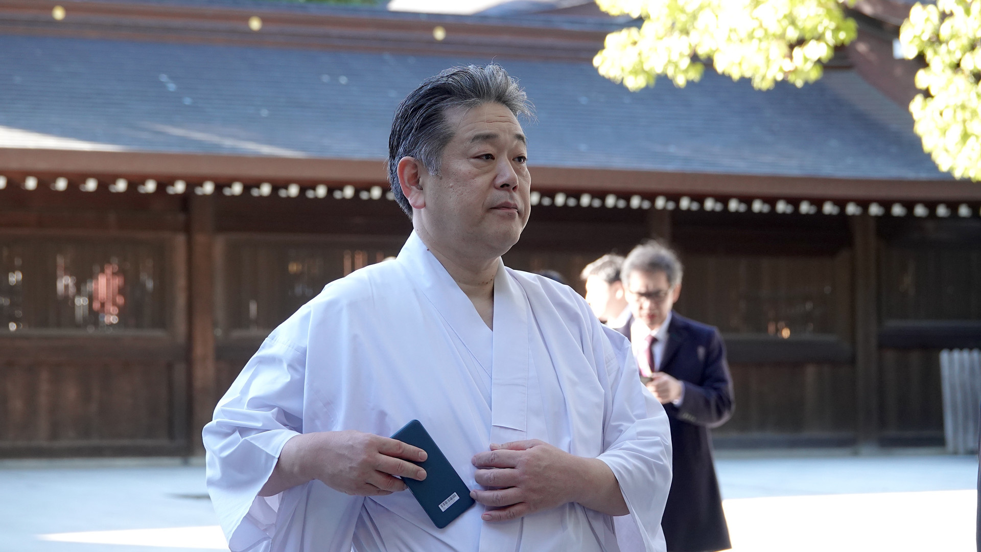 White kimonos, anticipation of a high-ranking guest — and a smartphone carefully hidden in the folds of traditional clothing.