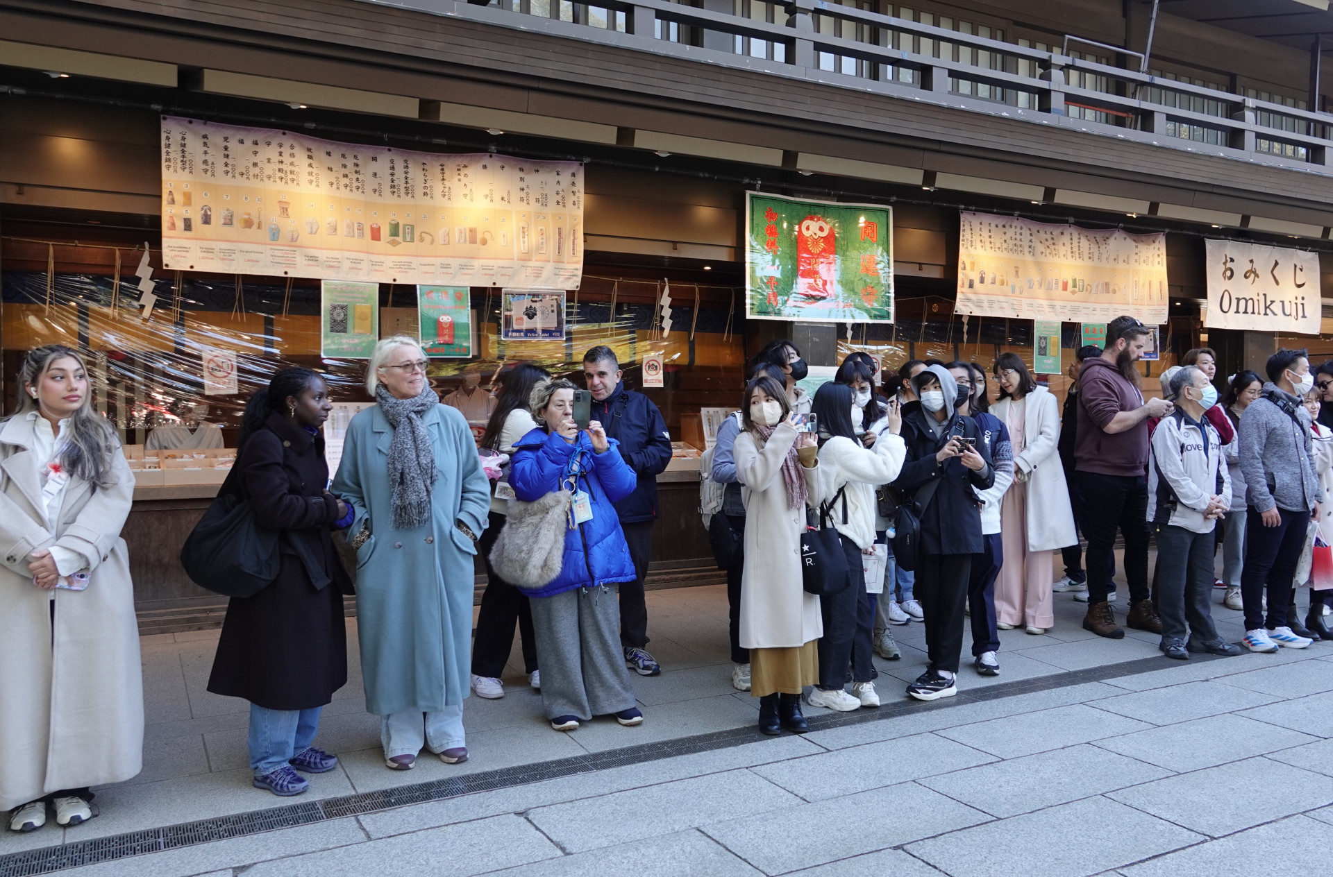 Temple visitors freeze in anticipation of the person for whom cameras and attendants have gathered today. In Japan, even waiting looks organized.