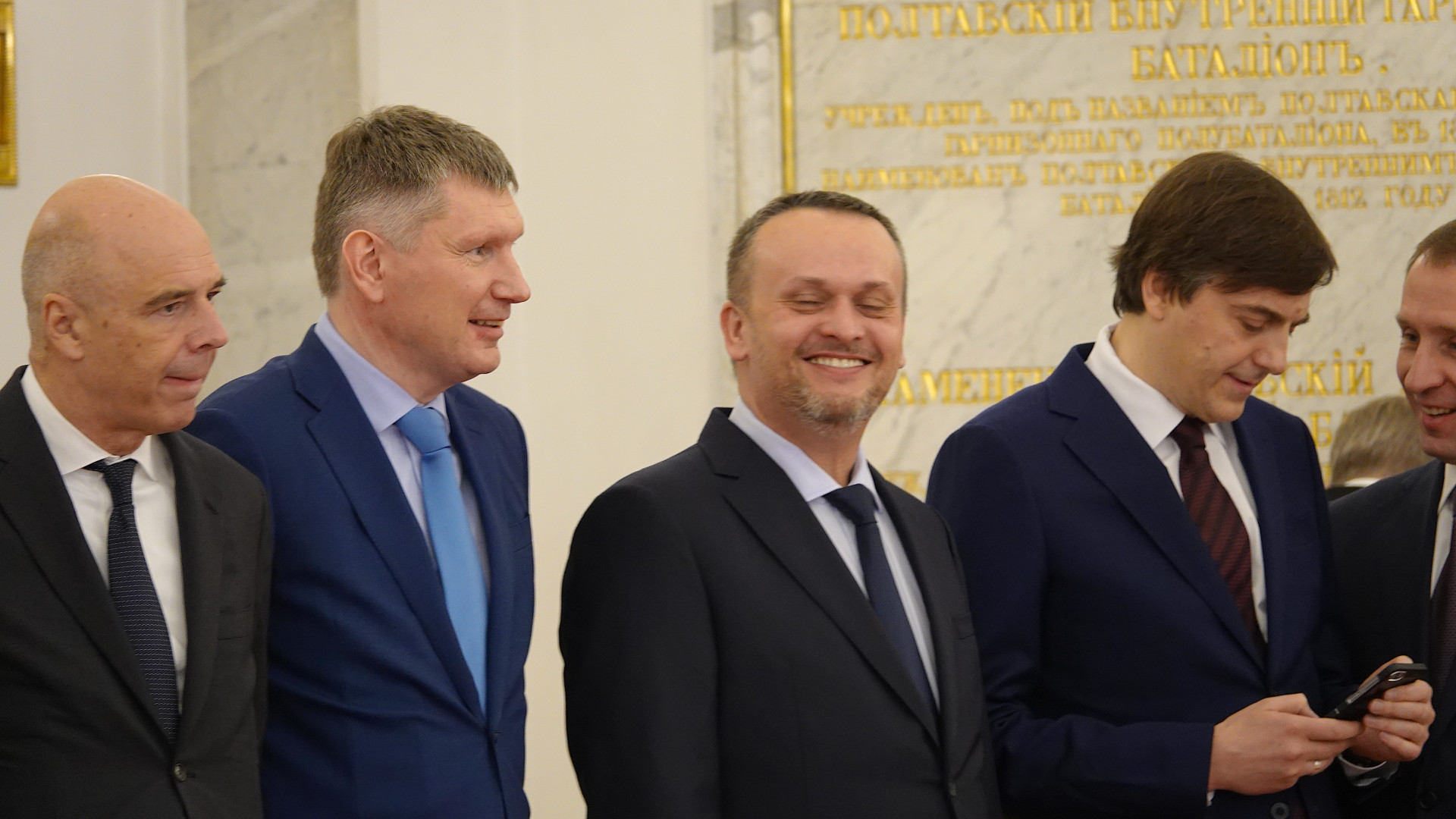 And here are his colleagues — Elvira Nabiullina, head of the Russian Central Bank, and Russia’s Finance Minister Anton Siluanov. Their faces are serious — most likely thinking about the same things: budgets, rates, percentages.