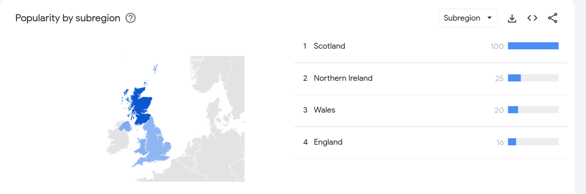According to Google Trends, Scotland showed the highest concentration of queries, followed by Northern Ireland, Wales, and England. Football fans rushed online not only to check the score but also to figure out where Kazakhstan is, whether it is part of Europe, and even if it’s a rich country.