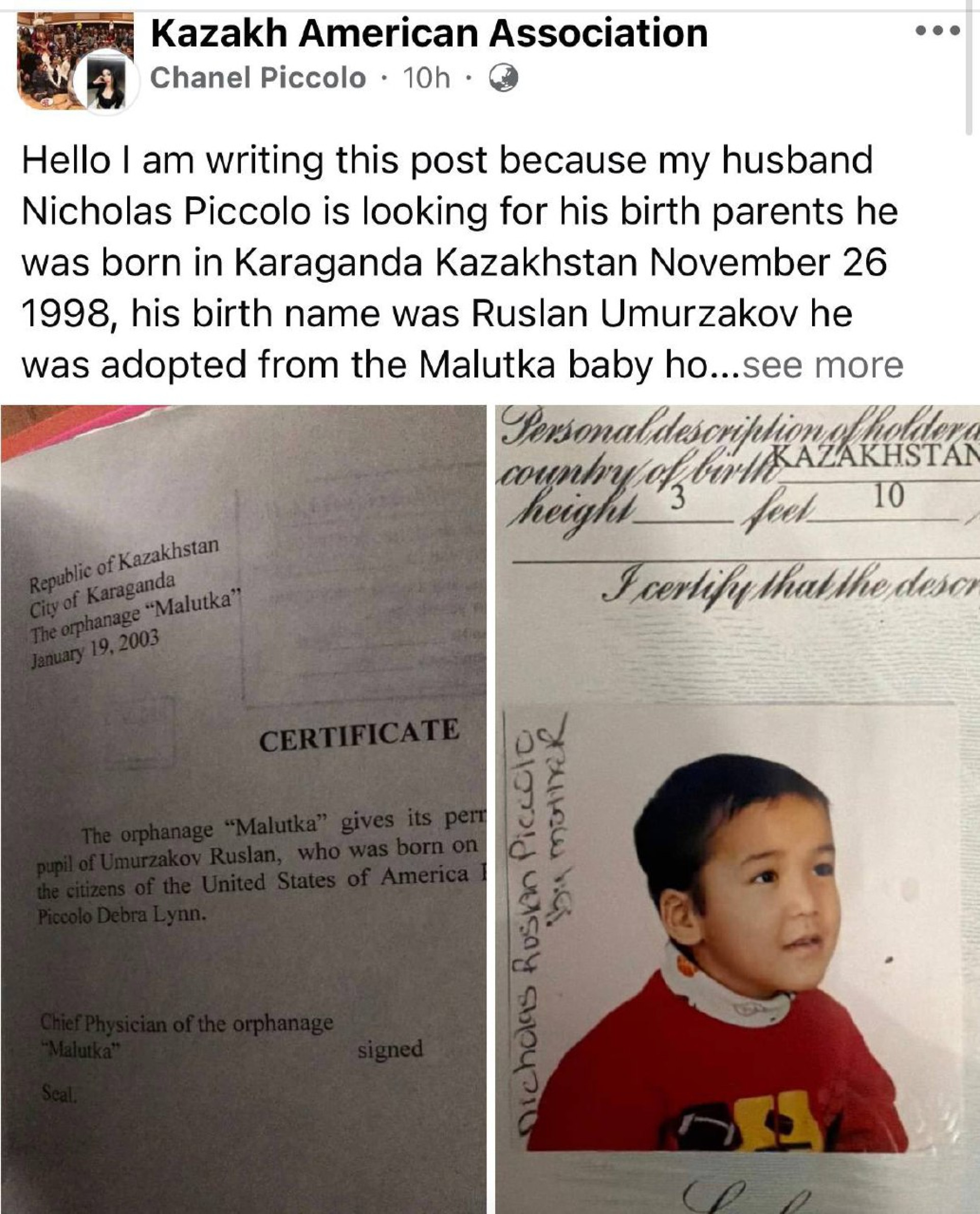 “Hello I am writing this post because my husband Nicholas Piccolo is looking for his birth parents he was born in Karaganda Kazakhstan November 26 1998, his birth name was Ruslan Umurzakov,” the post says.