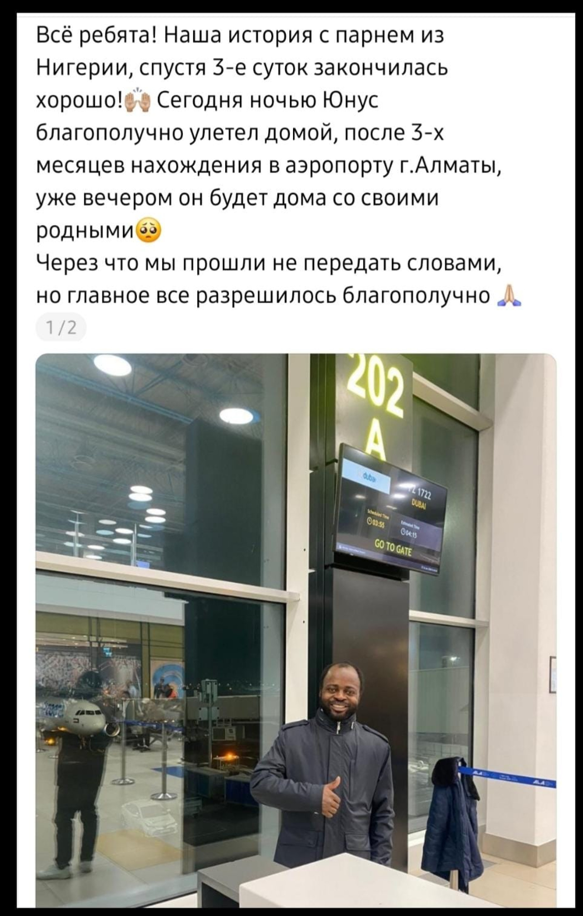 “The story with the guy from Nigeria ended well after three days. Tonight, Yunus safely flew home after spending three months at Almaty Airport. By evening, he’ll be with his family. What we went through is hard to put into words, but the main thing is that it ended well,” the author wrote.