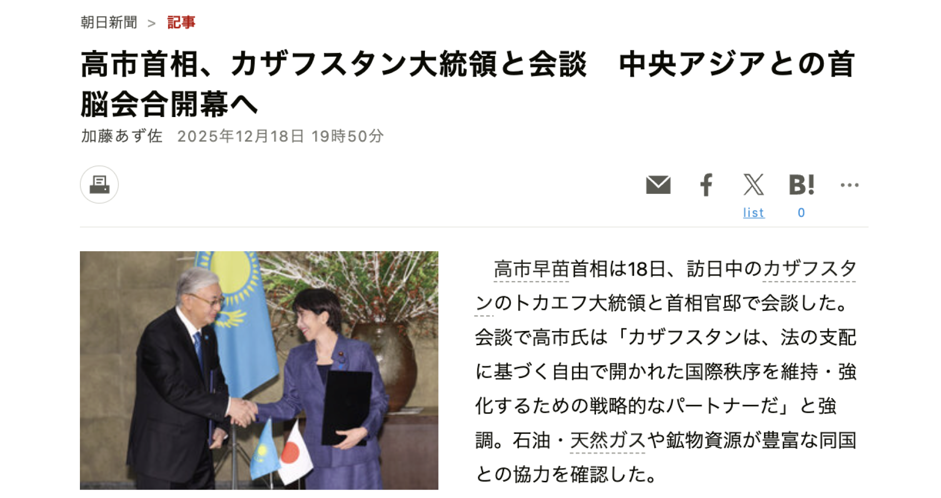 News agencies, primarily Jiji Press, build a chronological picture of the visit. In their reporting, talks with the President of Kazakhstan open the series of bilateral contacts between the Japanese Prime Minister and Central Asian leaders ahead of the summit. This detail is repeated and highlighted separately in agency materials.
