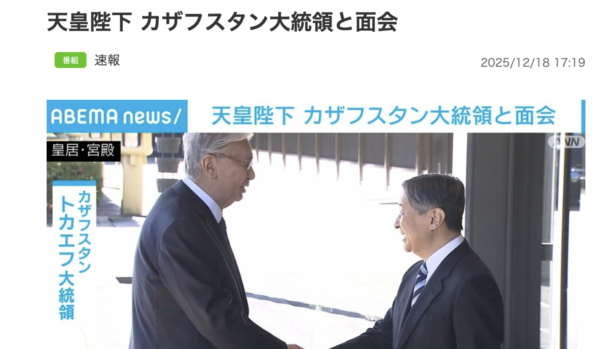 Television channels and news portals — including ABEMA NEWS, au Web Portal and regional broadcasters — described in detail the start of the visit: Tokayev’s meeting with the Emperor of Japan at the Imperial Palace, the personal greeting, a joint lunch and the participation of the Crown Prince. These reports contain little politics, focusing instead on the format of the reception and the atmosphere of the interaction.