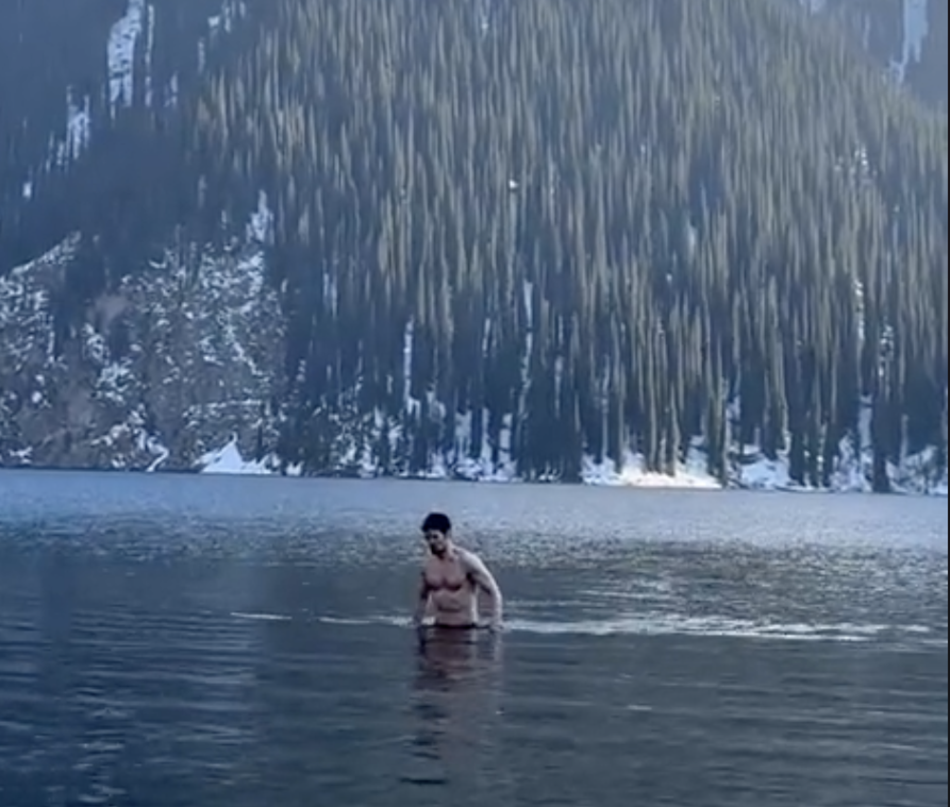 The footage shows the entrepreneur calmly entering the crystal-clear water of the scenic lake.