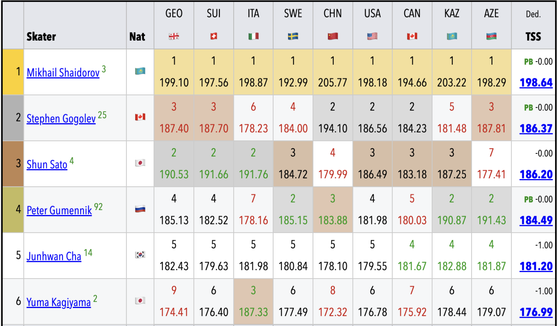 Shaidorov, in his gold medal-winning free skate, received his highest score — 205.77 points — from a Chinese judge, seven points above his overall average.