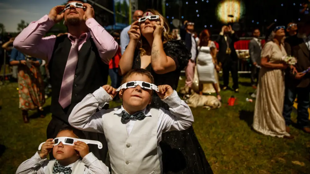 On April 8, a solar eclipse took place across North America. As the eclipse was visible in all its glory, Russellville, Arkansas hosted a festival called Elope at the Eclipse, where over a hundred couples exchanged vows. In this photo by photographer Aaron Huey, one couple and their children watch the four-minute total solar eclipse.